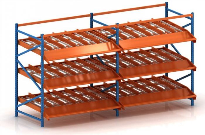 流利式貨架簡稱流利架,是將貨物置于滾輪上,利用一邊通道存貨,另一邊通道取貨。料架朝出貨方向向下傾斜,貨物在中立作用下向下滑動。可實現先進先出,并可實現一次補貨,多次揀貨。流利架存儲效率高。適合大量貨物的短期存放和揀選。流利架廣泛應用于配送中心、裝配車間以及出貨頻率較高的倉庫。